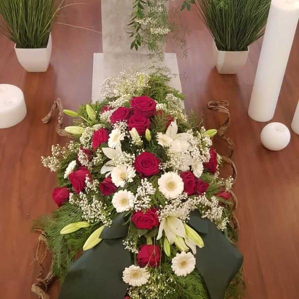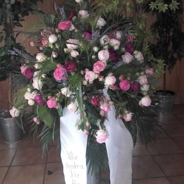 Aber auch zu traurigen Anlässen sind wir für Sie da. Ob Sarg- oder Urnenschmuck, Kränze oder Trauergestecke. Wir fertigen diese nach individueller Absprache mit Ihnen an. Eine eigene Trauerschleifendruckerei rundet diesen Service ab.